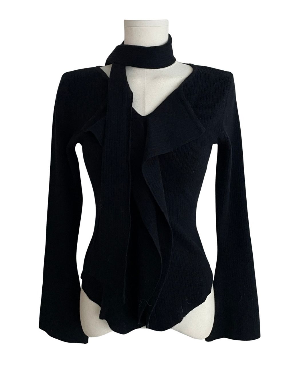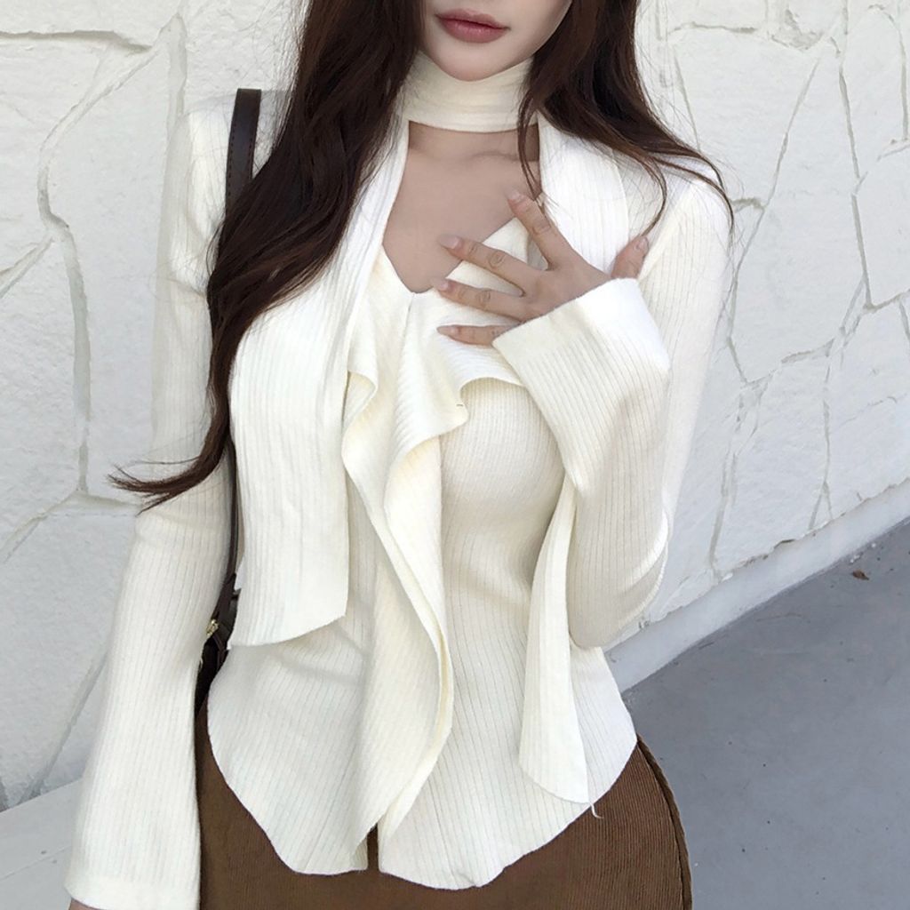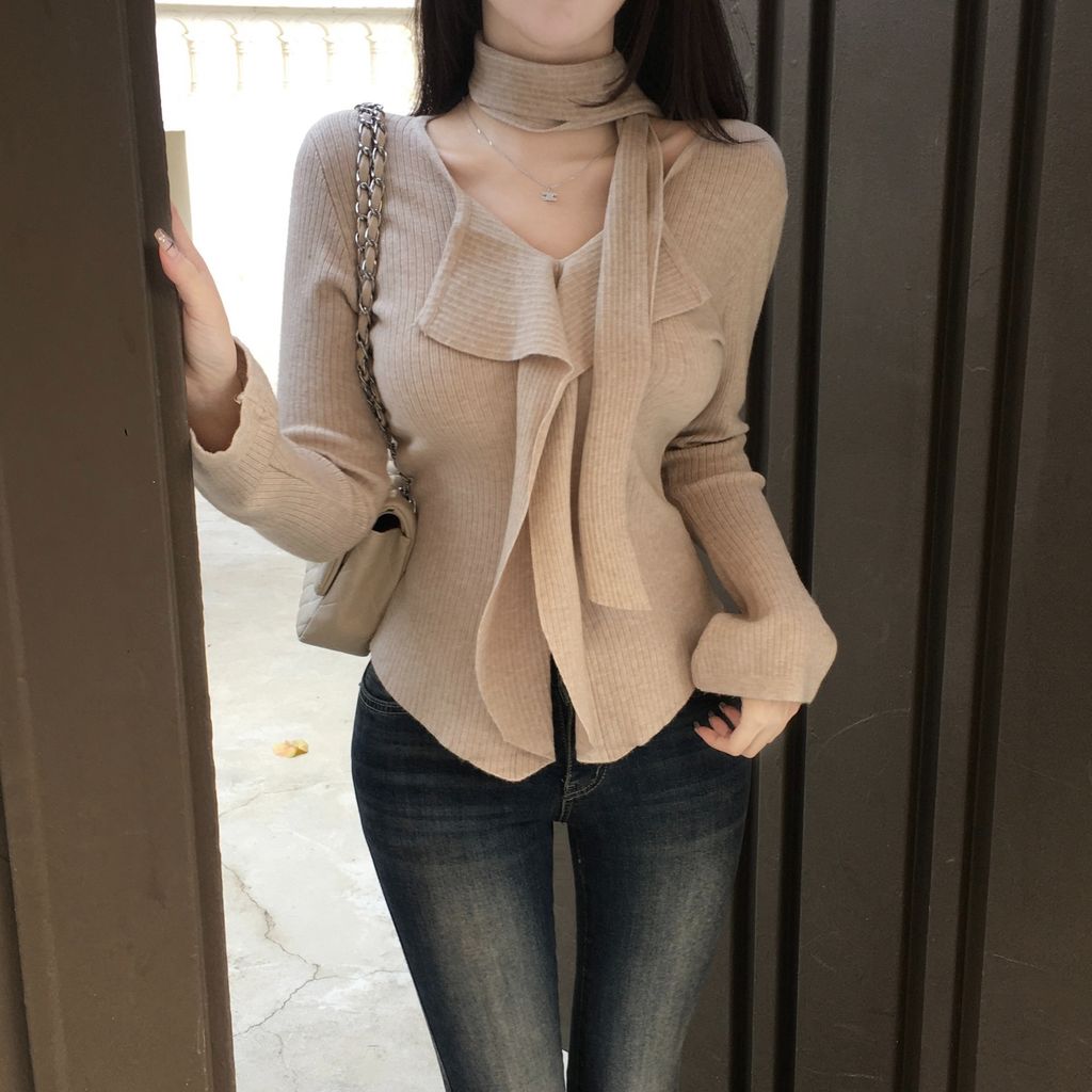 日常+約會通殺🔥胸前V字荷葉修身針織上衣+小領帶