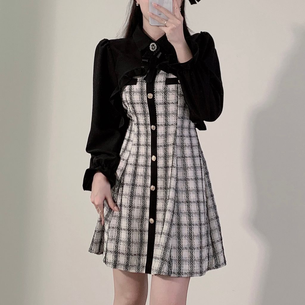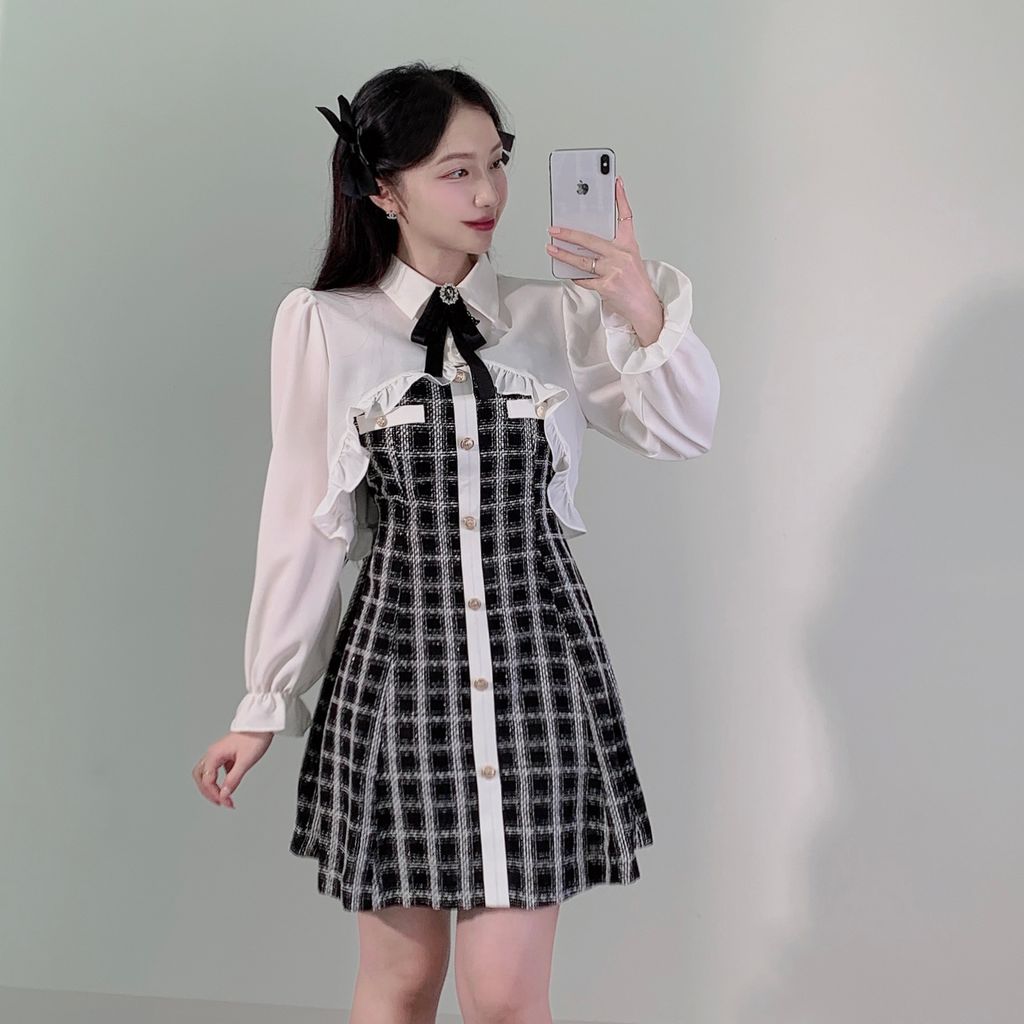 小香編織厚質感細肩帶洋裝+ 寶石領結荷葉小外套 SET