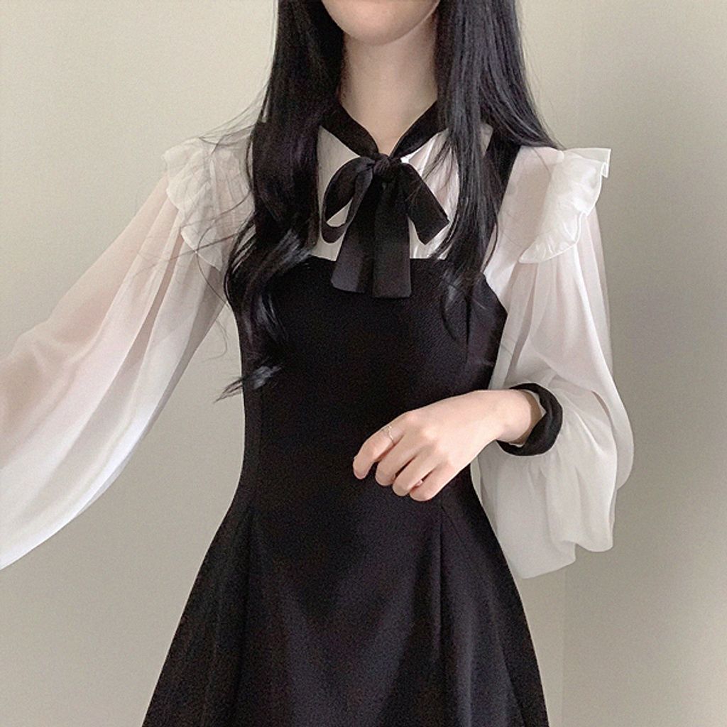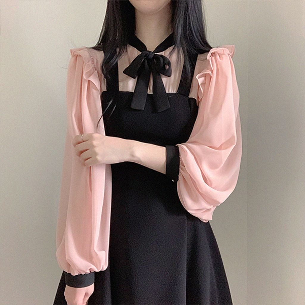 𝐑𝐎𝐒𝐄氣質路線🥀不限身材彈性💗Honey ops🍯 雪紡雙色荷葉感領帶傘狀洋裝