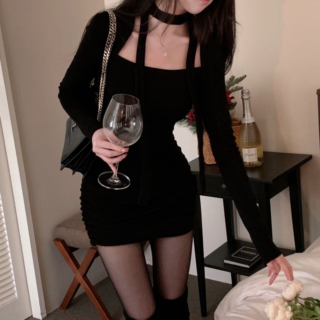 Christmas🎅直男男友𝒑𝒊𝒄𝒌🕺真的衣櫃一定要有的冬季❄️全刷毛親膚* 包臀包肩超修飾領帶洋裝 (2color)