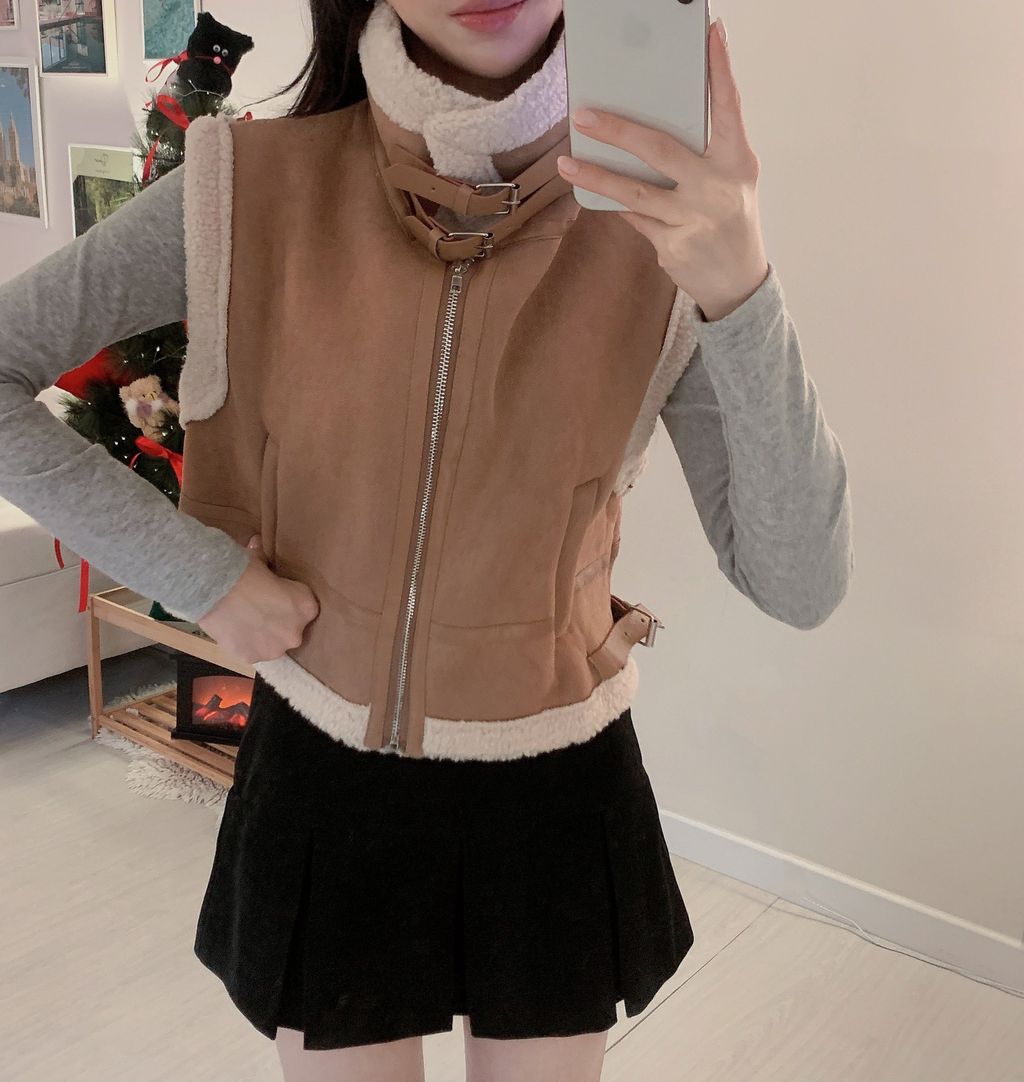 拼接毛毛蝴蝶結🎀上衣+ 燈芯絨混棉大摺褲裙+ 羔羊機車無袖背心外