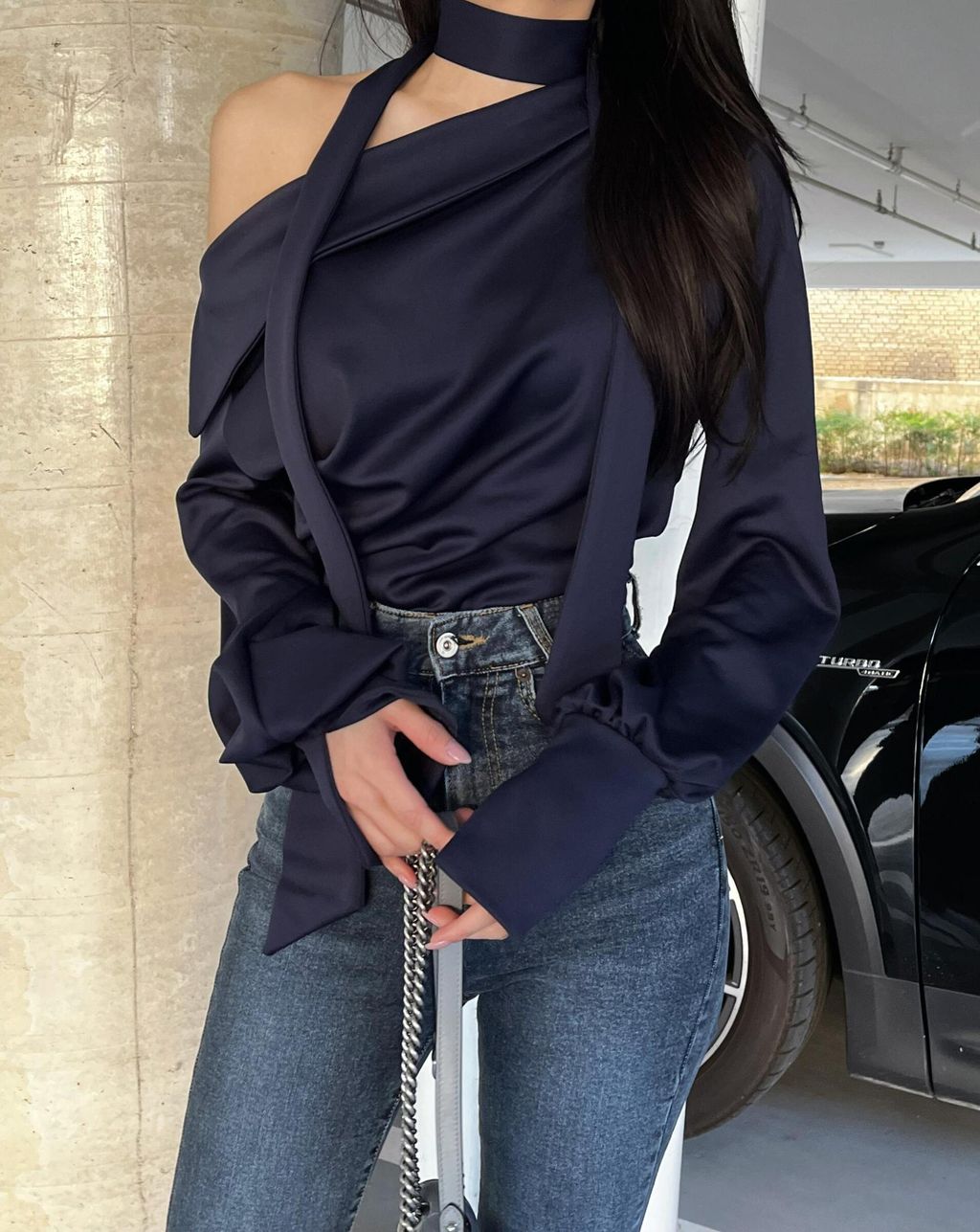 【原創檔口】直男男友One 𝒑𝒊𝒄𝒌!!🕺辣妹歐膩的斜露肩皺摺俐落blouse (光澤親膚4color)