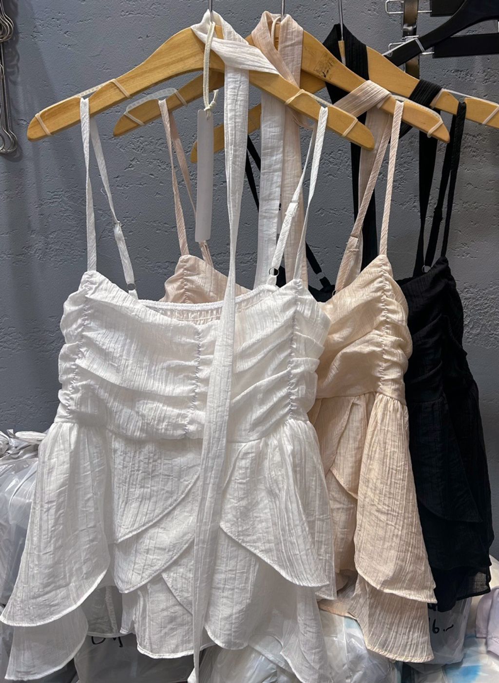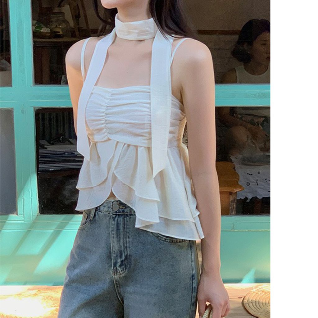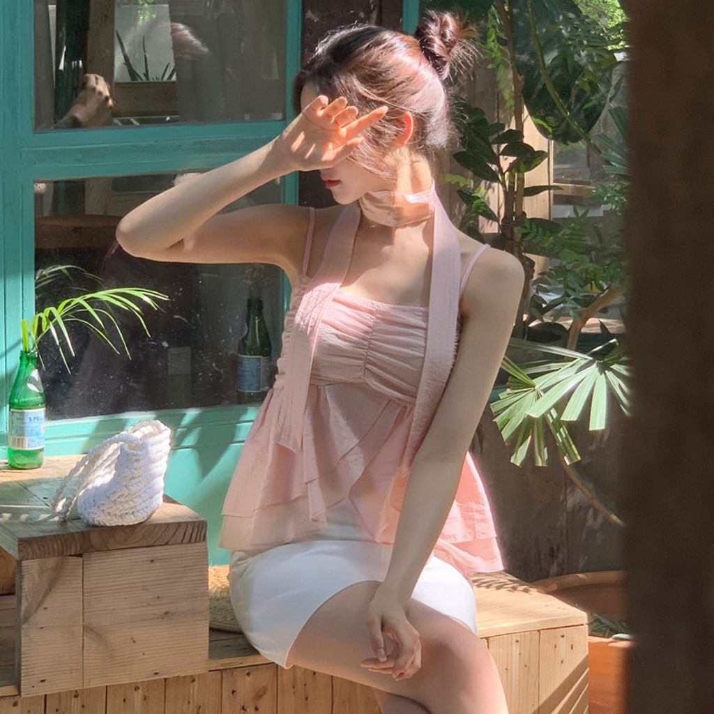 白,粉 夏末最後優惠特價🔥半彈性皺摺細肩帶飄逸下擺上衣+領帶 (3color)