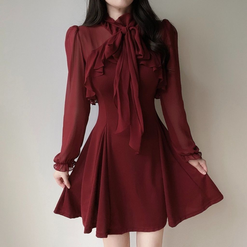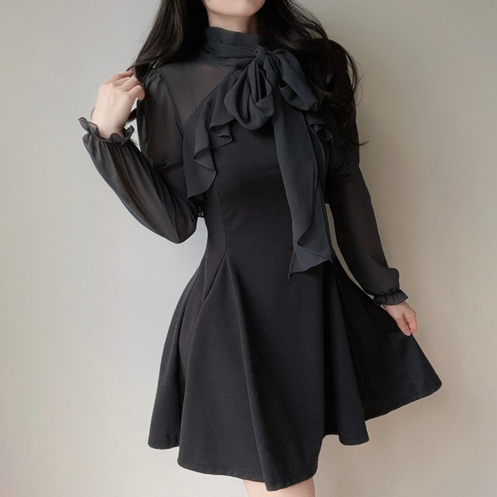 無尺寸限制的公主系列👸特色荷葉設計感雪紡拼接超彈性洋裝 (2color)