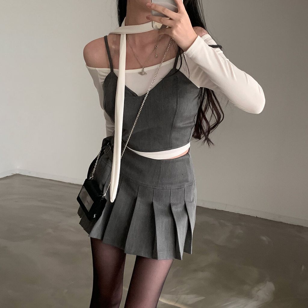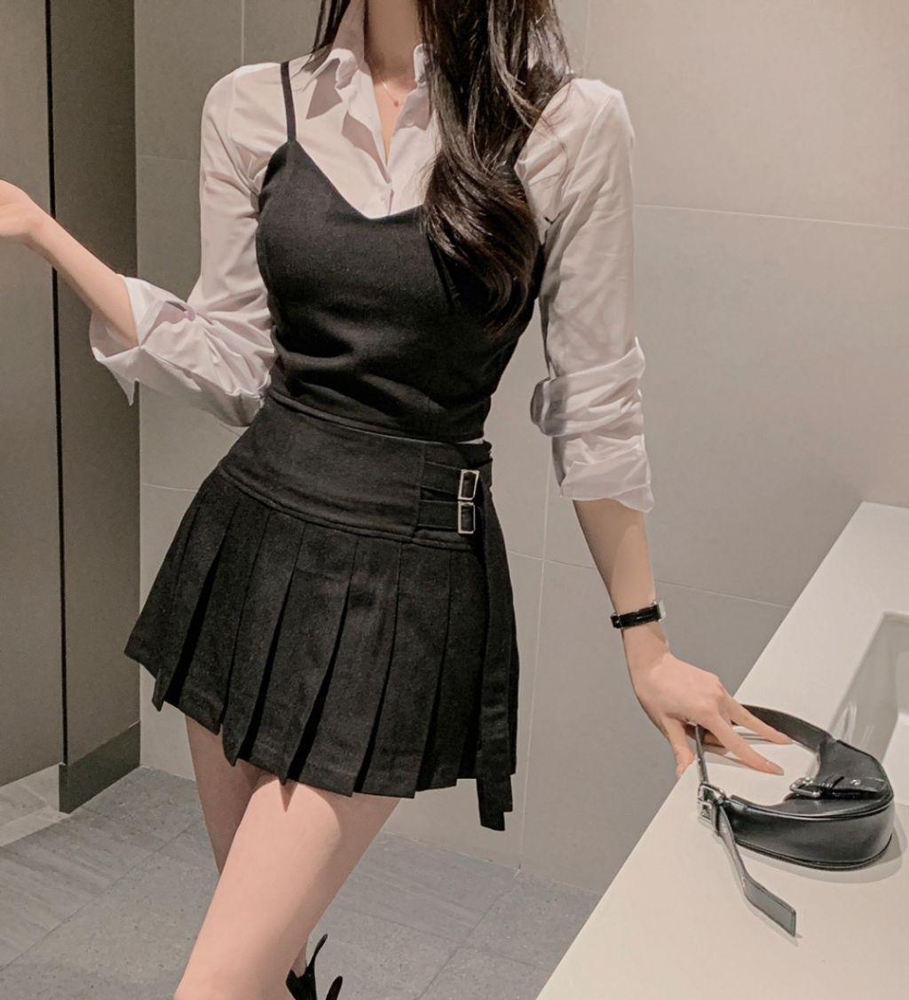 一穿即時髦🔥外搭西裝布料小背心+ 雙腰帶百褶裙 SET
