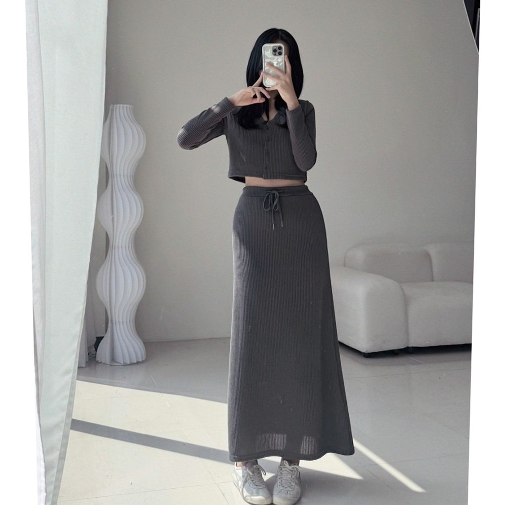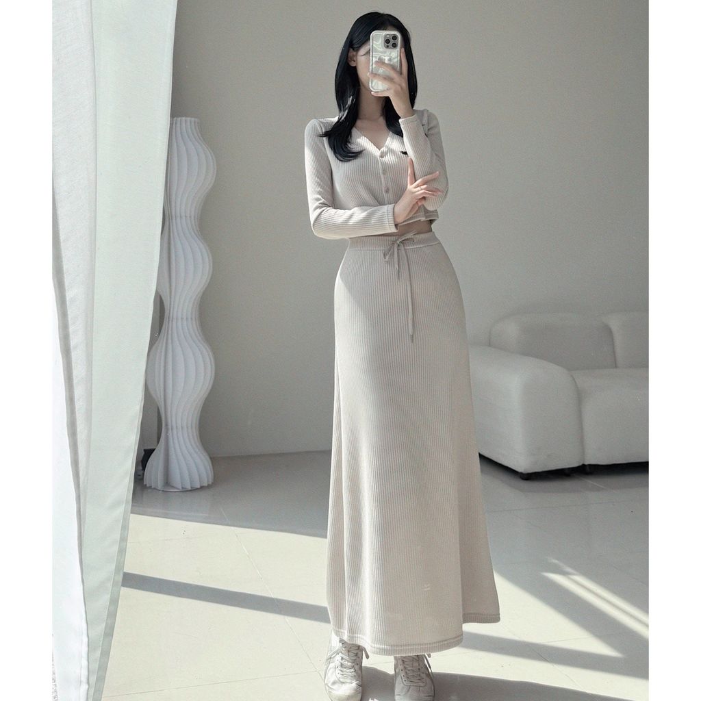 秋🍂安的遛狗私服XD💗꾸안꾸歐膩的休閒日常直壓紋短版外套+ 超級顯瘦低腰長裙SET