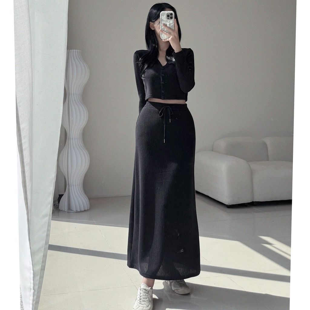 꾸안꾸歐膩的休閒日常直壓紋短版外套+ 超級顯瘦低腰長裙SET