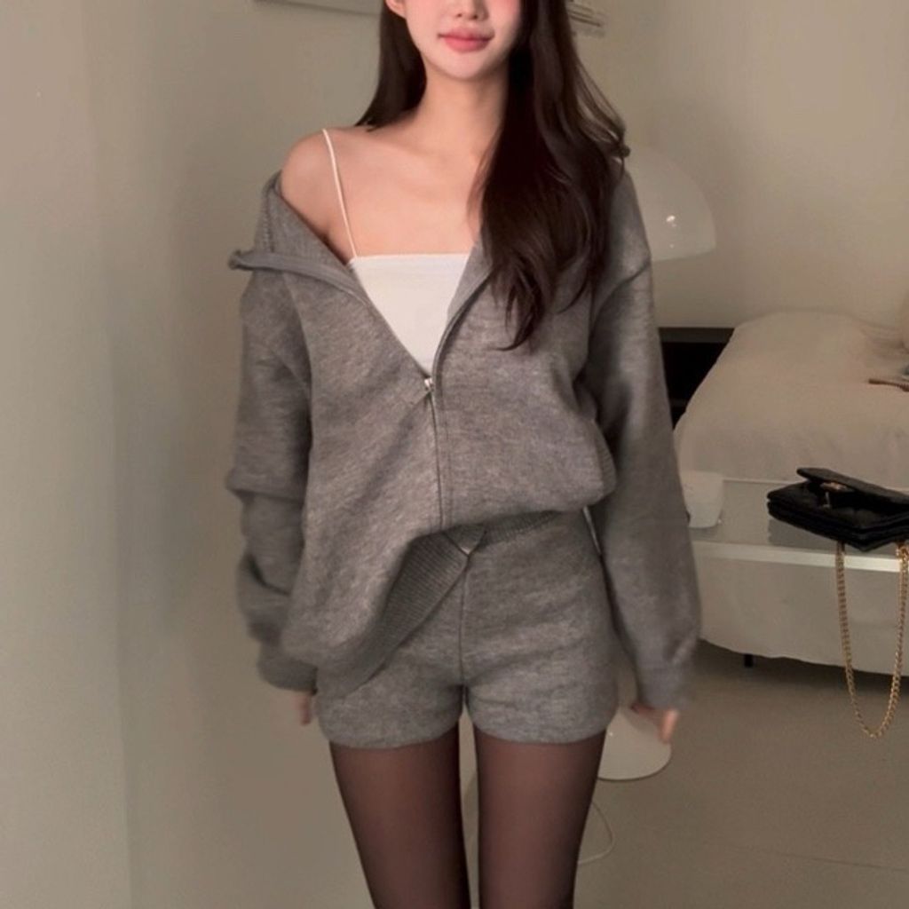 精挑厚質感超級寬鬆針織連帽外套+針織短褲SET