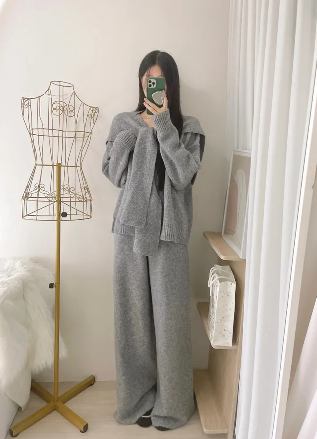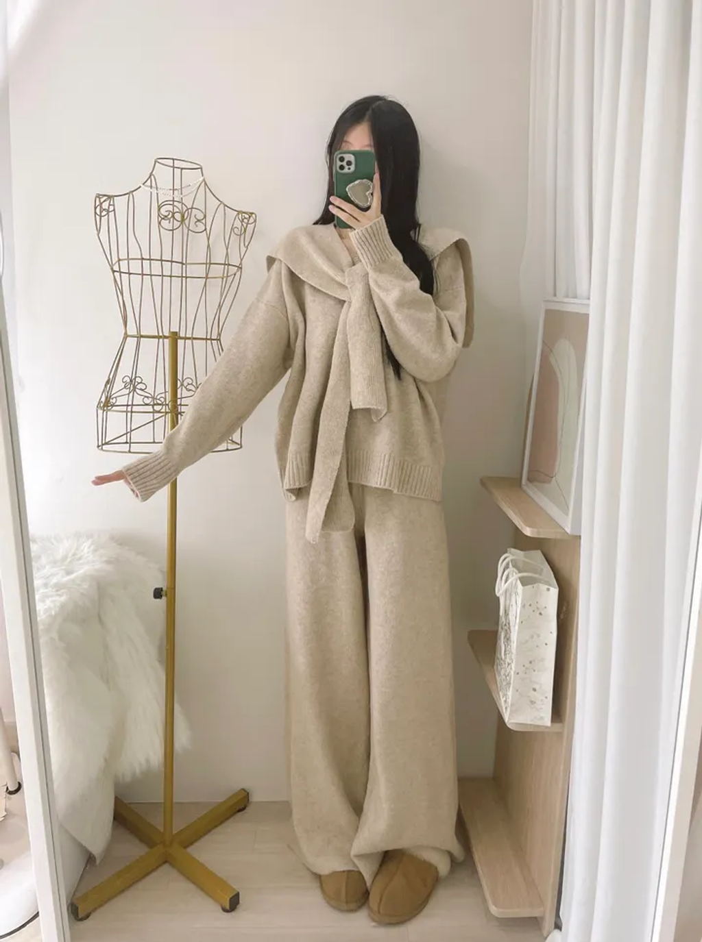 軟綿綿3件一套🫶掛肩領巾+ V領寬毛衣 + 大寬管彈性褲SET (3color)